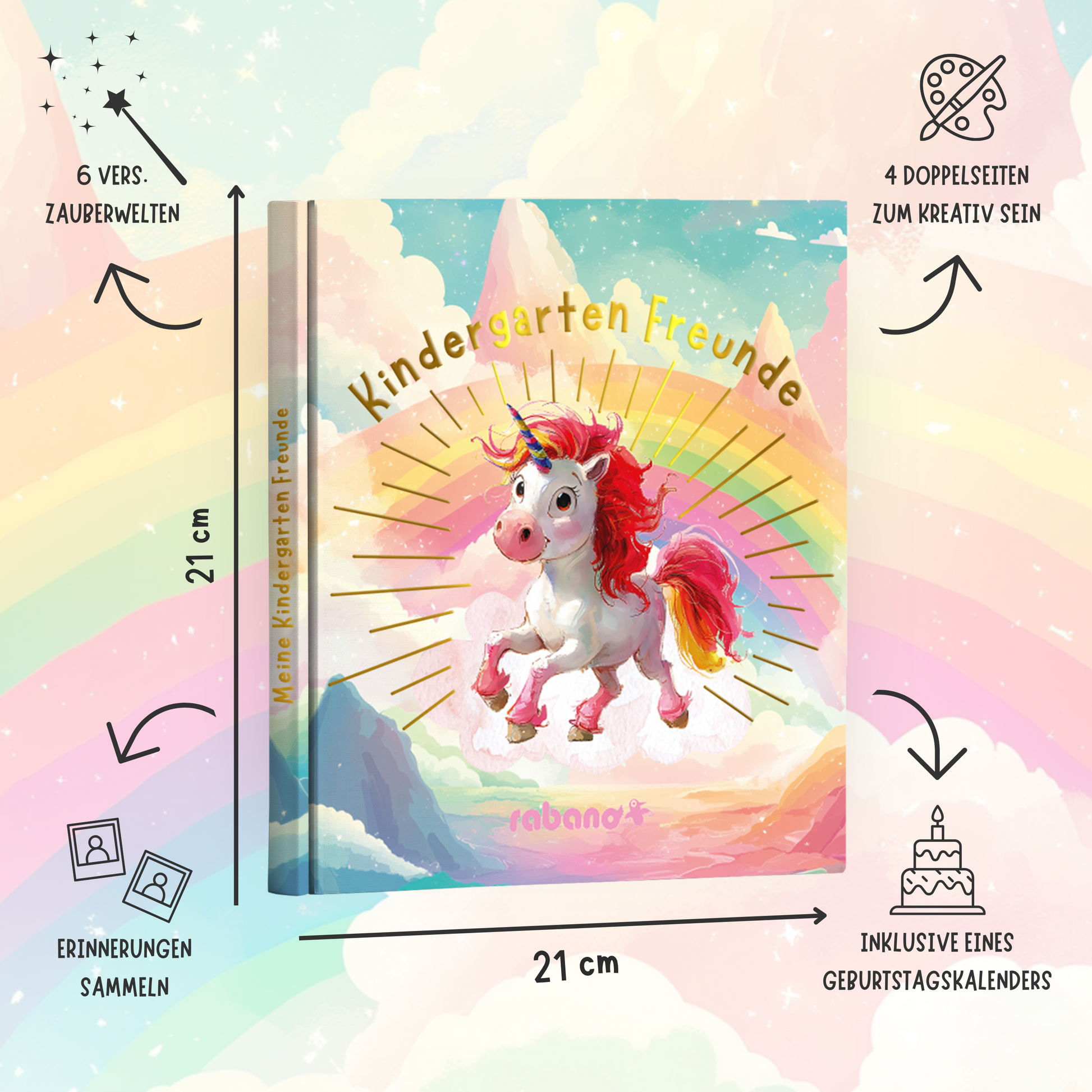 Unser Einhorn-Freundebuch bringt Abwechslung mit 6 einzigartigen Zauberwelten! Jede Seite ist liebevoll gestaltet und voller kreativer Details. Ein Muss für kleine Einhorn-Fans!