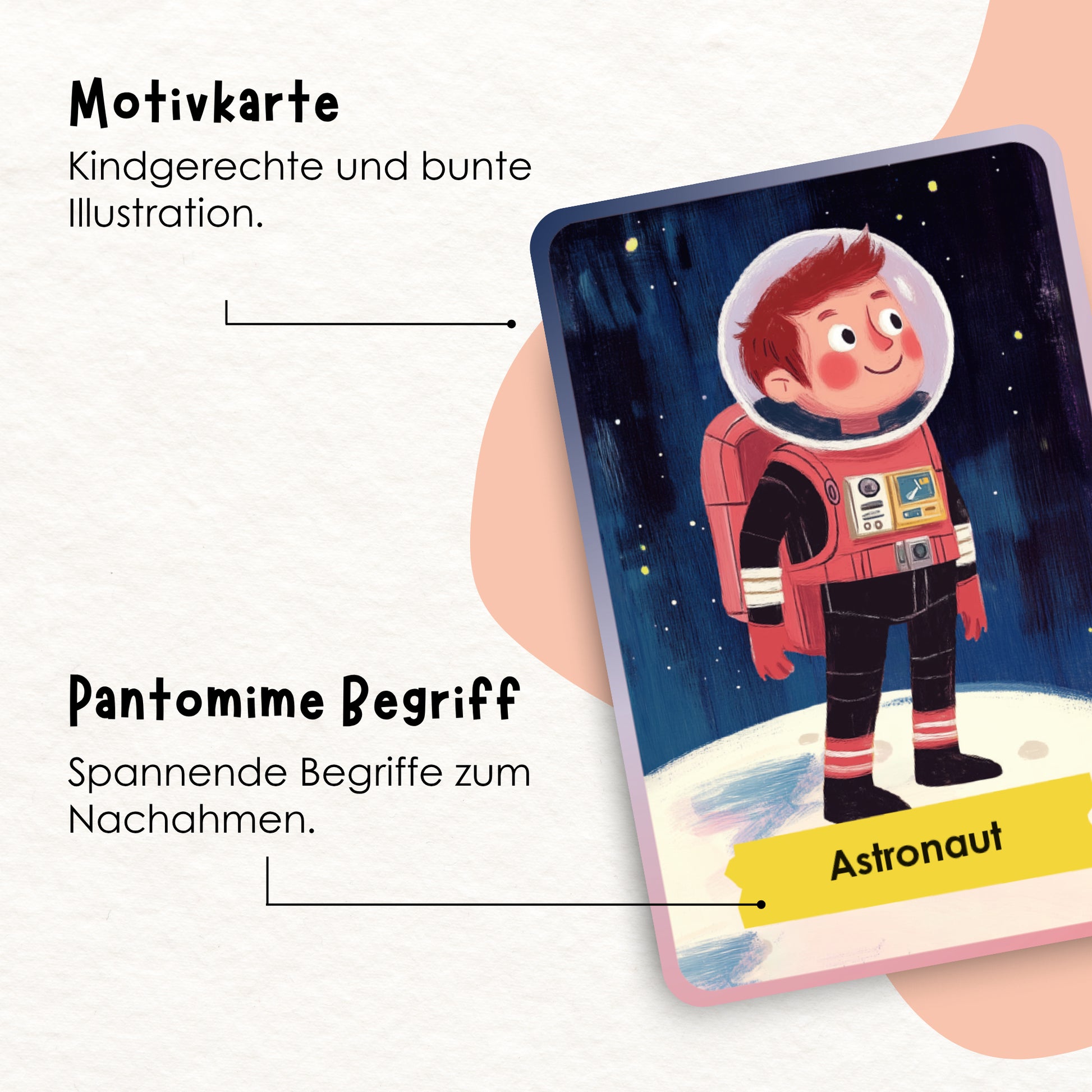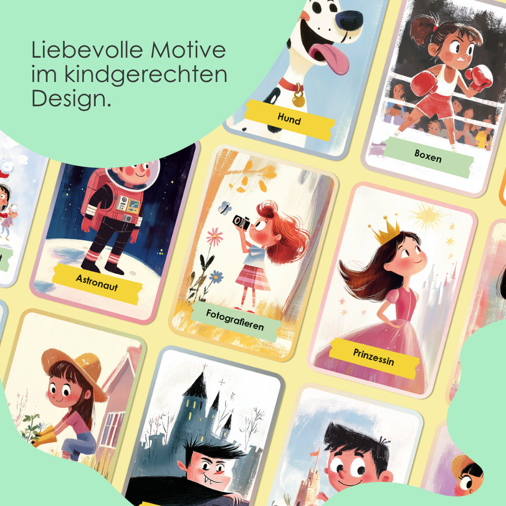 Das lustige Wer bin ich? -Spiel für Kinder bietet 50 leicht verständliche Motive aus den Bereichen Tiere, Berufe, Hobbys und Fantasie – perfekt auf die Welt der Kinder abgestimmt!